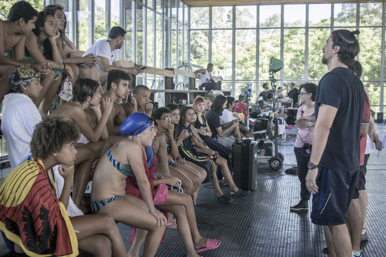 “O Fábio é o treinador da equipe de natação. Ele está, também, inserido na vida destes atletas. O filme investiga a personalidade destes jovens. Como, por exemplo, o fato de não conseguirem se comunicar com os pais. Esses hiatos que acontecem pela tecnologia e pelas coisas que estão surgindo e interferem na comunicação dos adolescentes. Ele tem uma proximidade muito grande com eles, por treiná-los. Eles viajam juntos, criam laços de afeto”, adianta Ligabue. Já Brídia, que vê tudo com muita excitação, complementa com mais detalhes sobre sua personagem: “Este filme é todo sobre a Amanda. Não sei como definir, se é comédia, ou drama. É sobre ela. É a vida dela. E, por isso, acabam acontecendo várias coisas que refletem esse momento que ela está vivendo”.
