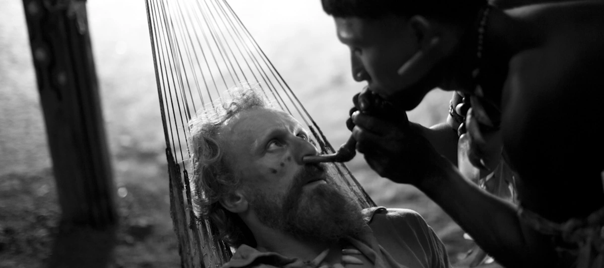 É impressionante o que Torres e Bolívar realizam como protagonistas desta história. Ambos são estreantes e carregam o filme nas costas, convencendo totalmente como dois diferentes extremos de uma mesma pessoa. O primeiro vive Karamakate com o vigor da juventude, cercado de certezas a respeito de sua cultura e dos malefícios que o homem branco trouxe para a sua região. O segundo traz a sabedoria esperada em um índio idoso. Mesmo que diga que tem problemas de memória e que não consegue se lembrar de fatos do passado, Karamakate claramente esconde um segredo. Não é apenas a maquiagem ou o figurino que nos convencem de que estamos observando o mesmo personagem. São os pequenos gestos, a postura, o olhar. Palmas para Guerra, que conseguiu extrair incríveis performances destes estreantes intérpretes. Não bastasse isso, a narrativa de O Abraço da Serpente consegue passear bem pelas duas linhas narrativas, nos dando informações importantes apenas nos momentos em que se nota extremamente necessário que saibamos de algo. Portanto, se Richard Evans parece um tanto escuso, tentando comprar um índio com apenas 2 dólares, é possível imaginar que algo mais deve acontecer baseado nesta atitude. A Yakruna, apesar de ser um McGuffin (objeto que é procurado pelos personagens, importando apenas para fazer a história andar), acaba tendo maior relevância no terceiro ato, transformando a história em uma viagem lisérgica. Como a frase de efeito do filme deixa bem claro: para se curar é preciso sonhar. E sonhamos junto deles no desfecho da história.