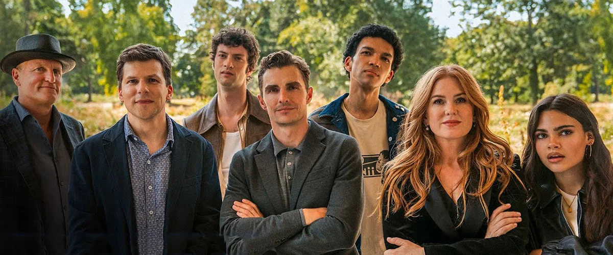 Pike é Veronika Vanderberg, uma empresária que fez fortuna no ramo familiar de explorar minas de diamantes em nações africanas castigadas por ações colonizadoras. Ela anuncia ao mundo a exibição da maior pedra preciosa já encontrada pelo homem, e tal manifestação motiva o novo golpe dos Cavaleiros – ou quase isso. Há quase uma década desaparecidos, eles acabaram sendo substituídos por farsantes tão ou mais talentosos do que aqueles que lhes serviram de inspiração. Bosco (Dominic Sessa, de Os Rejeitados, 2023), Ariana Greenblatt (Barbie, 2023) e Justice Smith formam esse trio que pretende ocupar o espaço deixado vago pelos famosos ilusionistas. Mas esses são convocados por uma misteriosa figura, e uma vez unidos com seus copiadores/admiradores, deverão trabalhar juntos em nome de uma justiça social que soa um tanto deslocada, mas que rapidamente se vê deixada de lado em nome de sentimentos menos nobres, digamos: há uma questão de vingança em curso, e descobrir a identidade daquele responsável por orquestrar todos estes encontros talvez não venha a ser a grande surpresa que aqueles que estão na condução da história gostariam.