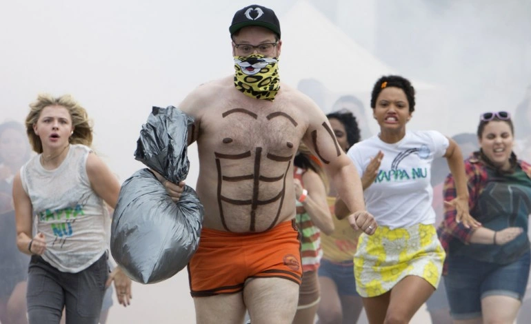 Em Vizinhos, Mac (Rogen) e Kelly Radner (Rose Byrne) decidem que estava na hora de serem adultos, se mudarem para o subúrbio e darem o primeiro passo rumo à paternidade. O que não esperavam, no entanto, era encontrar na casa ao lado uma fraternidade de estudantes universitários – que, como manda o clichê, estão mais preocupados com festas, agitos e arruaças do que com os estudos. Ao mesmo tempo em que se ia qualquer oportunidade de descanso e tranquilidade para os protagonistas, eles começavam também uma guerra com a turma ao lado, liderada pelos alucinados Teddy Sanders (Zac Efron) e Pete (Dave Franco). Havia uma leve discussão – interessante sem ser enfadonha – sobre maturidade, encarar desafios e assumir responsabilidades, e a boa química entre os atores completava o pacote. Em Vizinhos 2, no entanto, ao invés de propor uma nova trama que colocasse os elementos conhecidos diante de uma situação inédita, tudo que se tem é o que já foi visto, apenas mudando o discurso: se antes os arruaceiros eram garotos, agora são meninas que estão dispostas a tudo em nome de uma suposta “igualdade de direitos”.